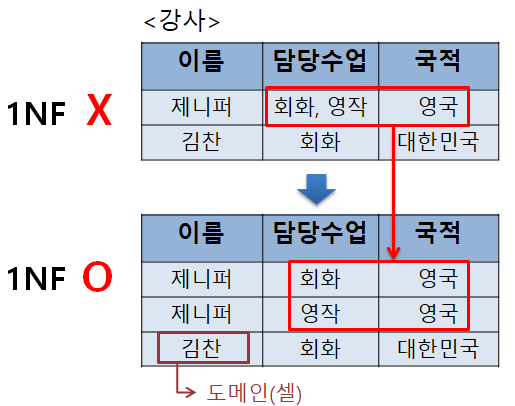 아래 <강사>테이블처럼 각 셀이 더 작게 나눌 수 없는 단일 값을 가진다는 말이다.