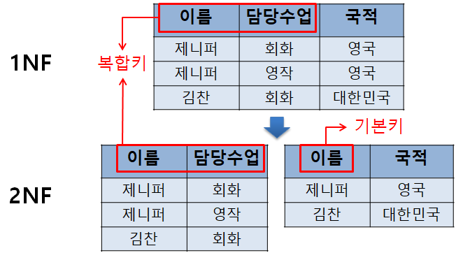 두 번째 테이블은 속성{국적}이 키 전체{이름}를 참조해 2NF조건을 충족한다.