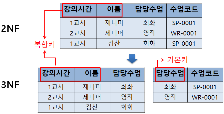 위 2NF테이블에서 복합키{강의시간, 이름}가 속성{담당수업}을 결정한다. (X→Y)